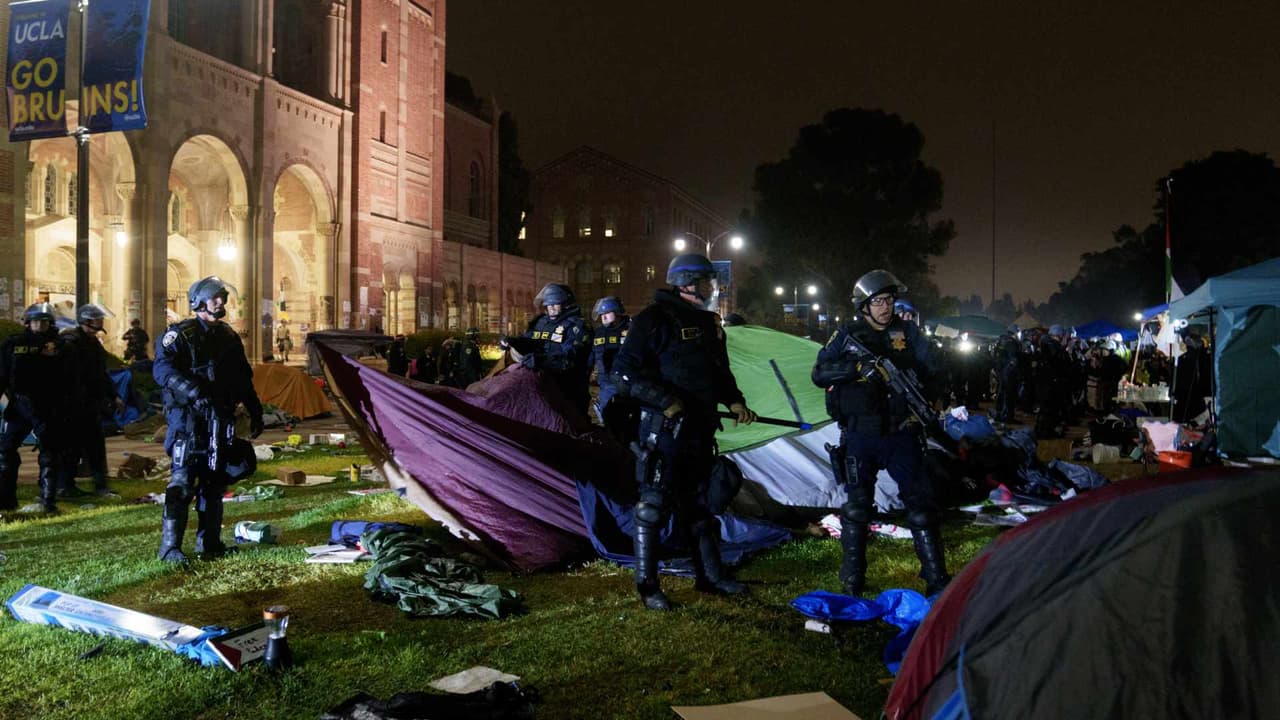 La Patrulla de Caminos desalojó la madrugada de este jueves un campamento propalestino en la Universidad de California en Los Ángeles y confirmó la detención de varias personas. La vigilancia policiaca se mantiene en el plantel y los estudiantes tendrán clases remotas como medida preventiva. Sigue aquí las últimas noticias sobre las protestas en universidades de EEUU.