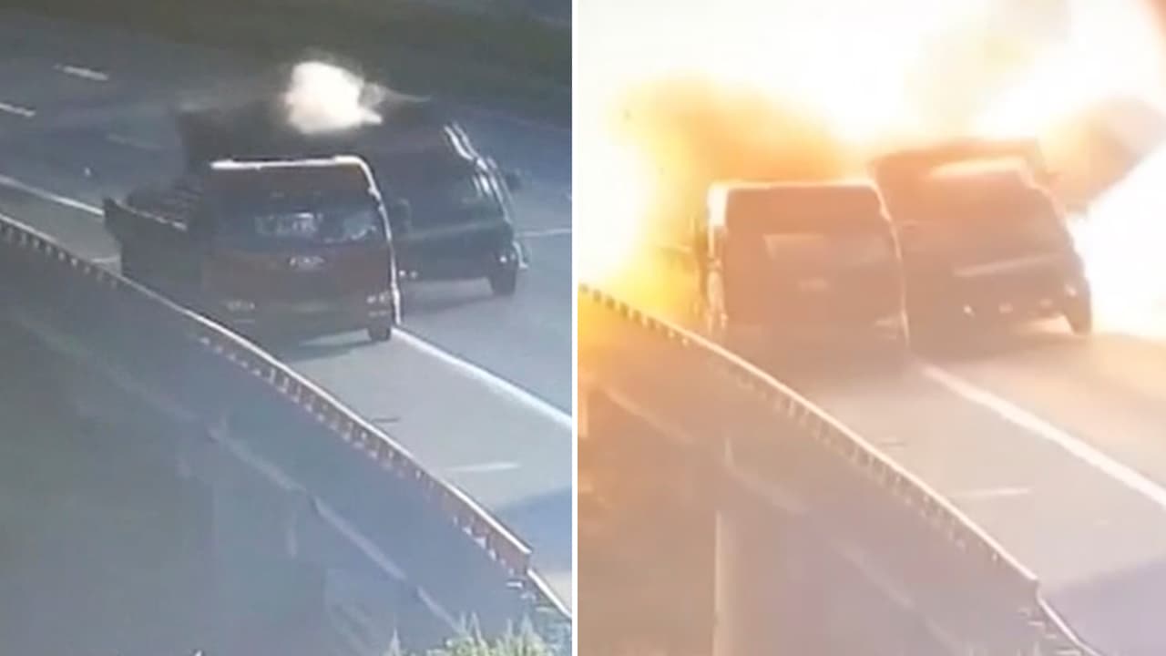 Un choque de un vehículo de carga contra una grua estacionada en la vía causó una gran explosión en una autopista en la periferia de Hangzhou en la provincia china de Zhejiang.