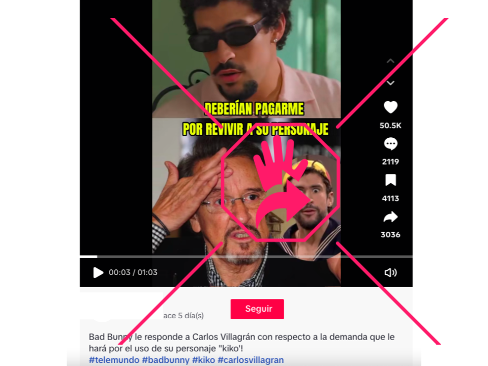 En nuestra búsqueda lo que encontramos también fue un supuesto video de Bad Bunny en TikTok respondiéndole a Villagrán por la presunta demanda. El mismo no proviene de la cuenta oficial del cantante ni de la de ningún medio reconocido, pero en las imágenes se le escucha decir, supuestamente, al puertorriqueño: “Cómo va a decirme a mí que me va a demandar por interpretar a ‘Quico’. Está como mal de la cabeza el señor, si debiera de pagarme por devolverle la vida a su personaje”.