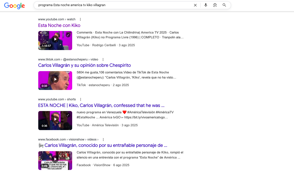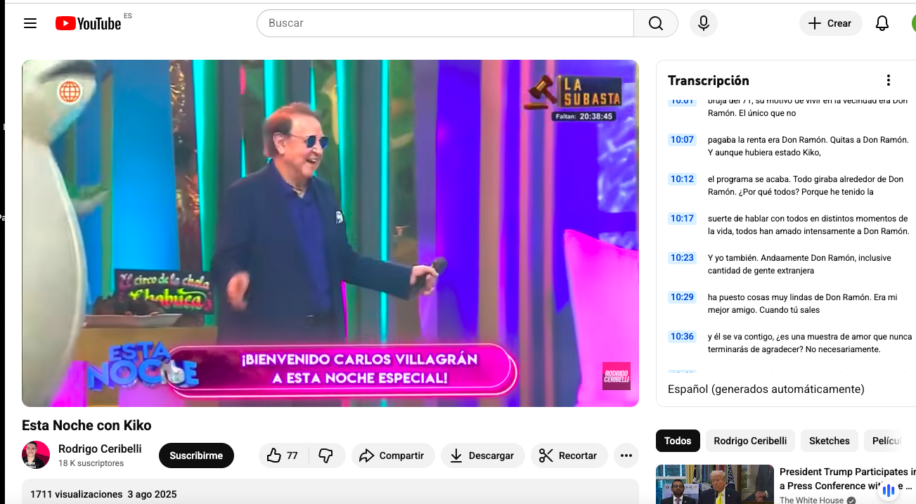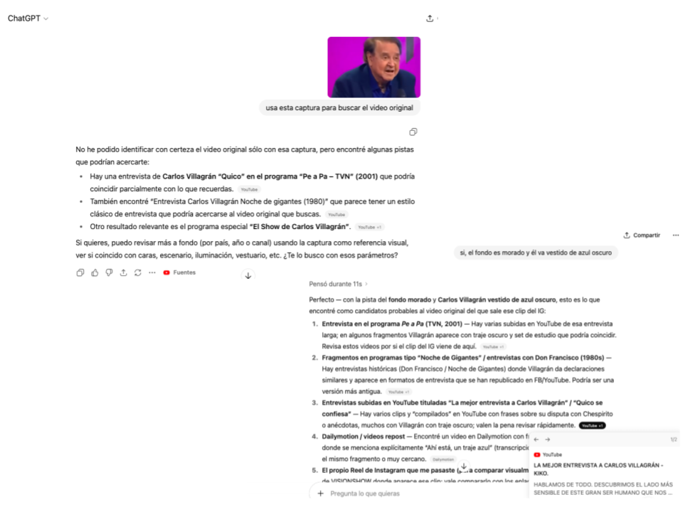 En elDetector introdujimos una captura del video en ChatGPT para dar con la grabación original de Villagrán y, luego de también proporcionarle al asistente de IA algunos detalles sobre la imagen, la búsqueda arrojó varios enlaces, entre los que estaba un video del canal de YouTube de la cadena peruana América Televisión, del 4 de agosto de 2025, en el que se ve al intérprete de ‘Quico’ vestido con la misma ropa y delante del mismo fondo morado que se puede observar en el video viral en el que supuestamente habla de la demanda contra Bad Bunny.