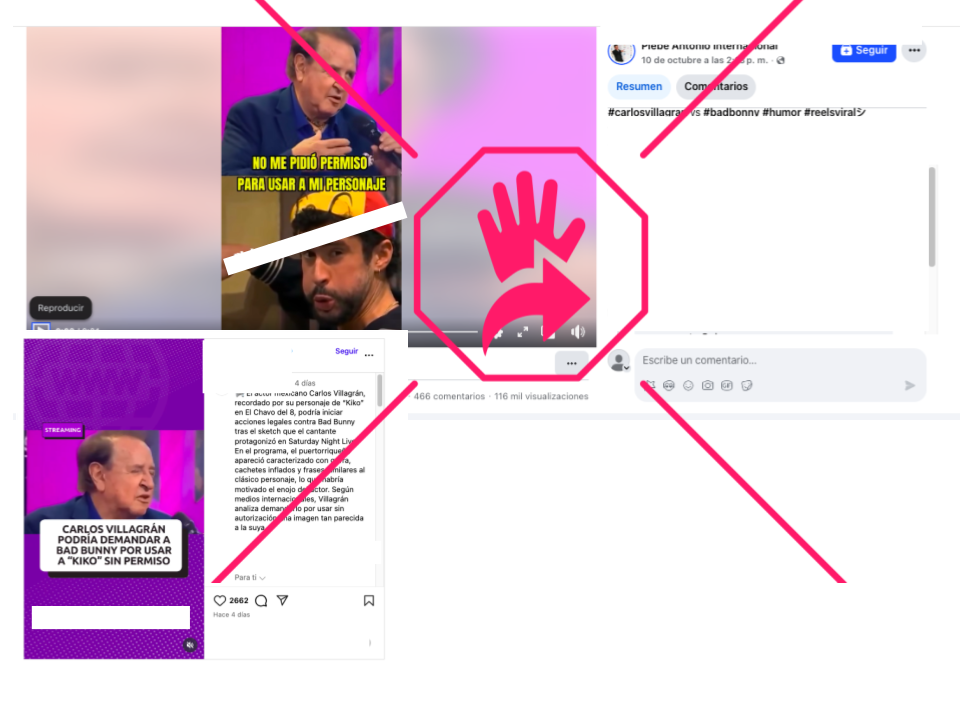 “Que Bad Bunny sepa que lo voy a demandar, lo voy a demandar por usurpar la imagen de mi personaje, mi esencia, y lo peor de todo es que no pidió mi consentimiento para interpretar a ‘Quico’, y eso es lo que más me molesta”, se escucha supuestamente decir a Villagrán en el video compartido en Facebook el 10 de octubre de 2025 y que tiene más de 100,000 visualizaciones. Otros similares circulan en distintas redes sociales.