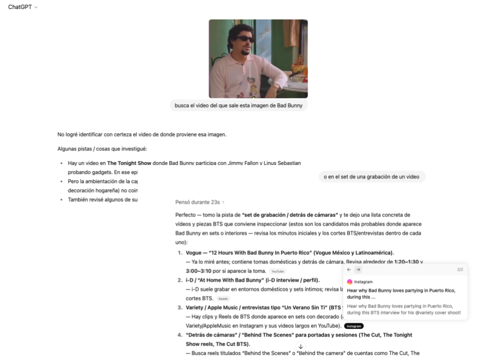 Así que introdujimos una captura de pantalla del mismo en ChatGPT para buscar la versión completa de la grabación y, luego de proporcionarle más datos sobre las imágenes al asistente de IA, nos dio una lista de opciones, entre las que se encontraba un clip en Instagram en el que se ve al cantante con la misma ropa, lentes de sol y en el mismo ambiente del video en el que supuestamente responde a Villagrán. Allí se dice que se trata de una entrevista con la revista Variety.