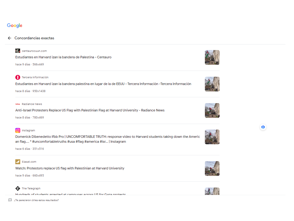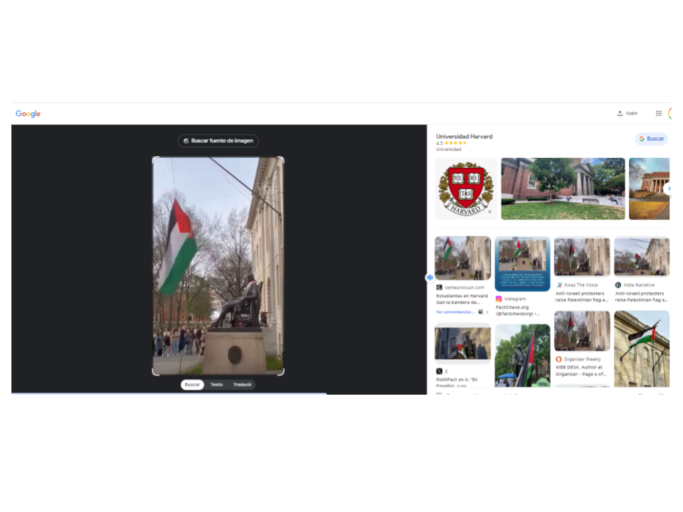 Una búsqueda inversa de imágenes en Google Lens nos confirmó que la fotografía y el video corresponden a la protesta del 27 de abril de 2024 en la Universidad de Harvard, y no a otras que se han realizado. Varios medios de comunicación registraron el suceso, especificando que ocurrió el sábado 27 de abril, e incluyeron imágenes de la bandera de Palestina izada en el campus similares a las que circulan en redes.