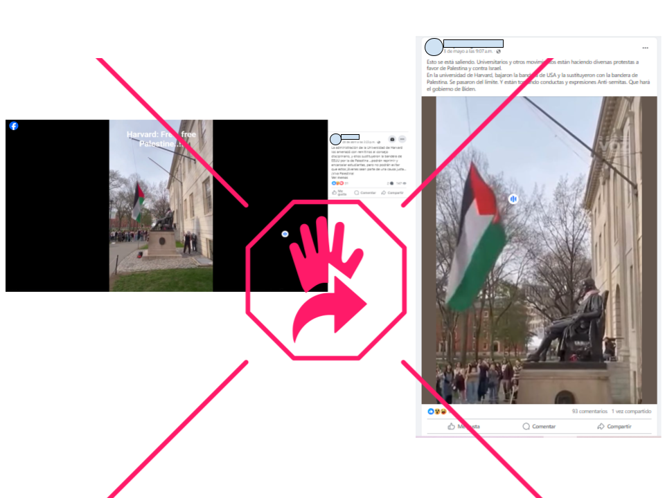 “En la universidad de Harvard, bajaron la bandera de USA y la sustituyeron con la bandera de Palestina. Se pasaron del límite. Y están tomando conductas y expresiones antisemitas”, se lee en varias publicaciones en Facebook compartidas a comienzos de mayo, después de la protesta del 27 de abril en ese campus. Sin embargo, esto es falso porque si bien ondearon estandartes palestinos, la bandera estadounidense no estaba izada en ese sitio específico de Harvard.