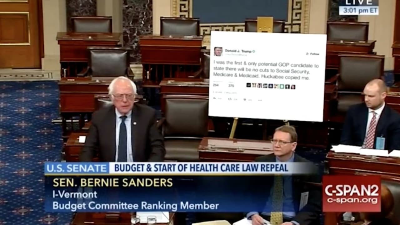 El senador por Vermont quiso mostrar cómo el presidente electo de EEUU había prometido no hacer recortes en la seguridad social y seguros sanitarios durante su campaña electoral.
