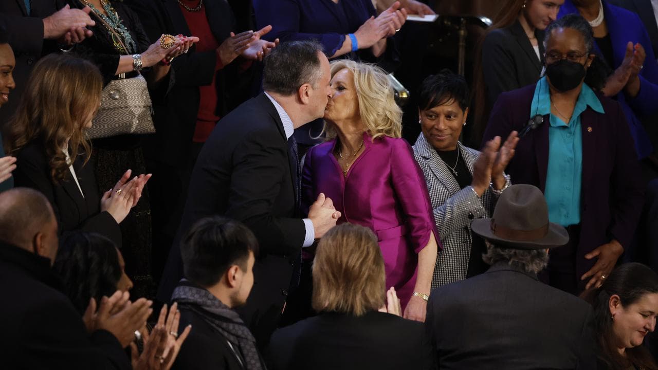 La primera dama Jill Biden y el esposo de la vicepresidenta Harris, Doug Emhoff, protagonizaron un muy comentado saludo momentos antes de que el presidente Joe Biden pronunciara su segundo discurso sobre el Estado de la Unión.