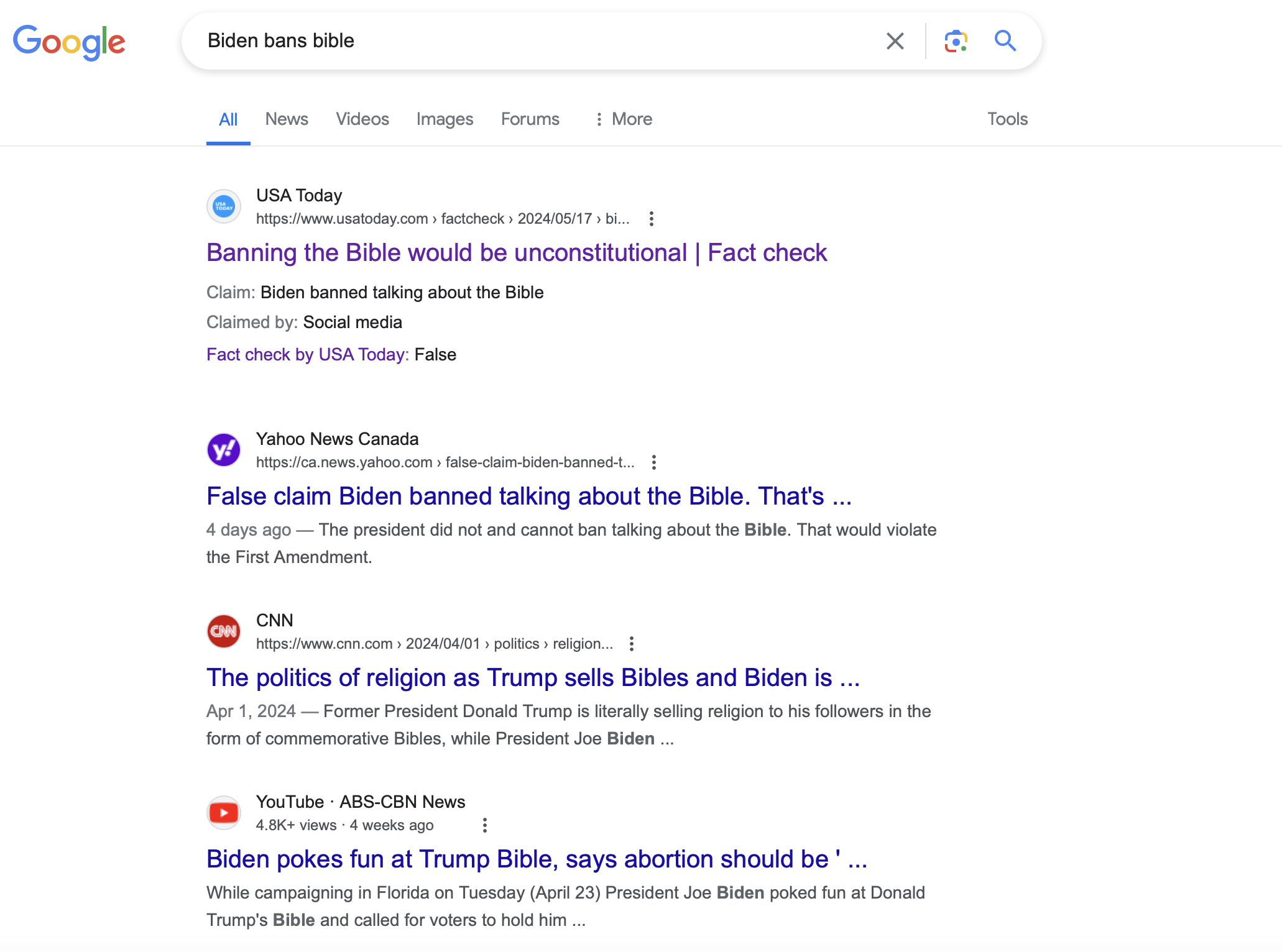 Con las mismas palabras clave en inglés, hicimos otra búsqueda, esta vez en Google, y tampoco hallamos ninguna noticia que anunciara la supuesta prohibición. Sin embargo, lo que sí encontramos fue una artículo publicado por USA Today miembro –como elDetector– de la Red Internacional de Verificadores de Datos (IFCN, en inglés) que calificó también el mensaje de que Biden prohibió hablar de la Biblia como falso y explica que tal prohibición sería inconstitucional. Cita a Caroline Mala Corbin, profesora de Derecho en la Universidad de Miami, quien además de indicar que el mandatario no tiene poder para prohibir la Biblia, recuerda que “la Primera Enmienda protege la libertad de expresión de la censura gubernamental”.