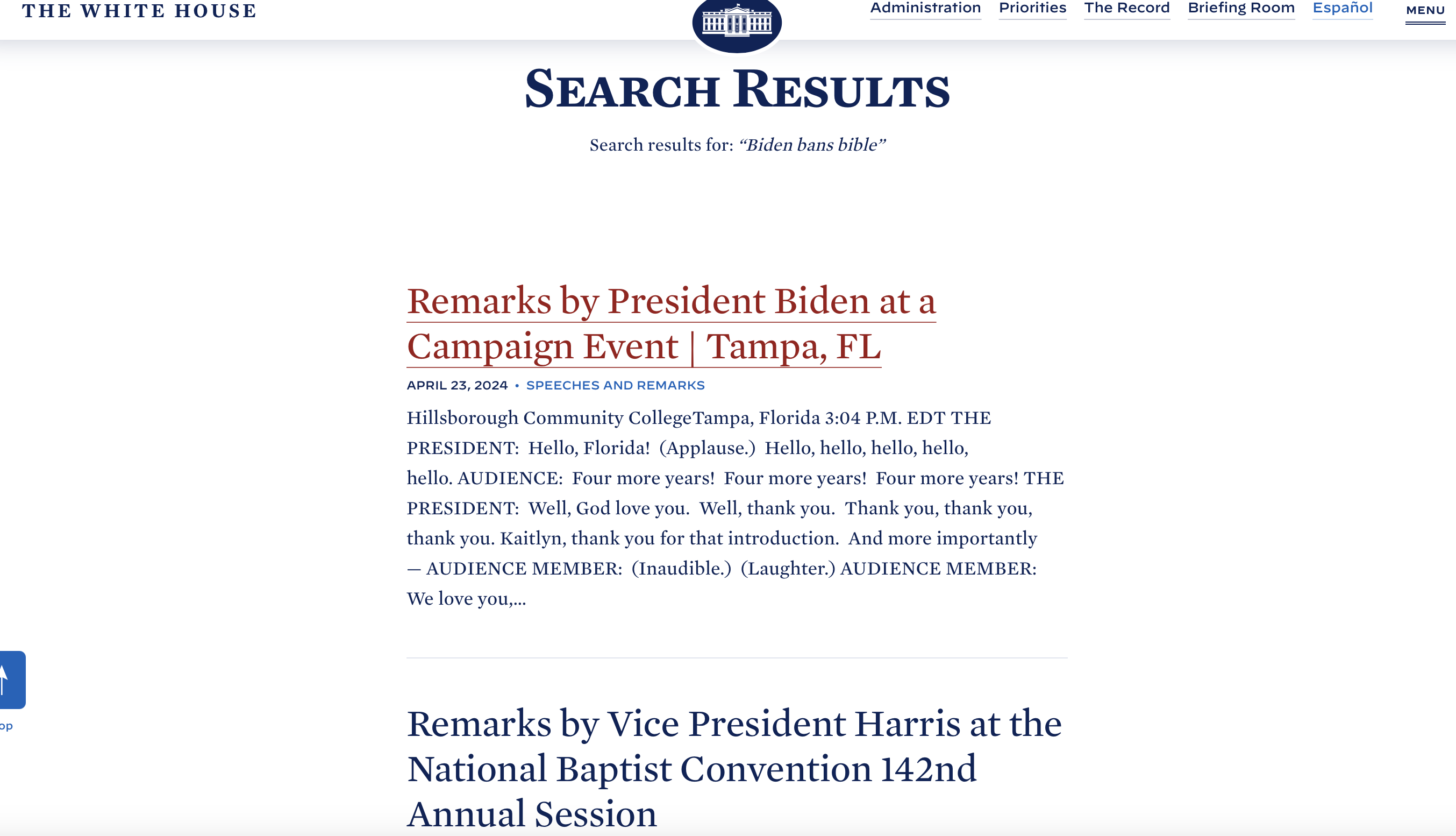 Lo primero que hicimos fue consultar a la Casa Blanca sobre el mensaje difundido que alega que Biden ha prohibido hablar de la Biblia y un funcionario respondió a elDetector, vía WhatsApp, que "esa información es falsa". Realizamos una búsqueda en inglés en el sitio web de la Casa Blanca con las palabras clave (Biden prohíbe la Biblia) y, entre los resultados, no encontramos ninguna afirmación que avale lo que se señala en los clips que estamos verificando.