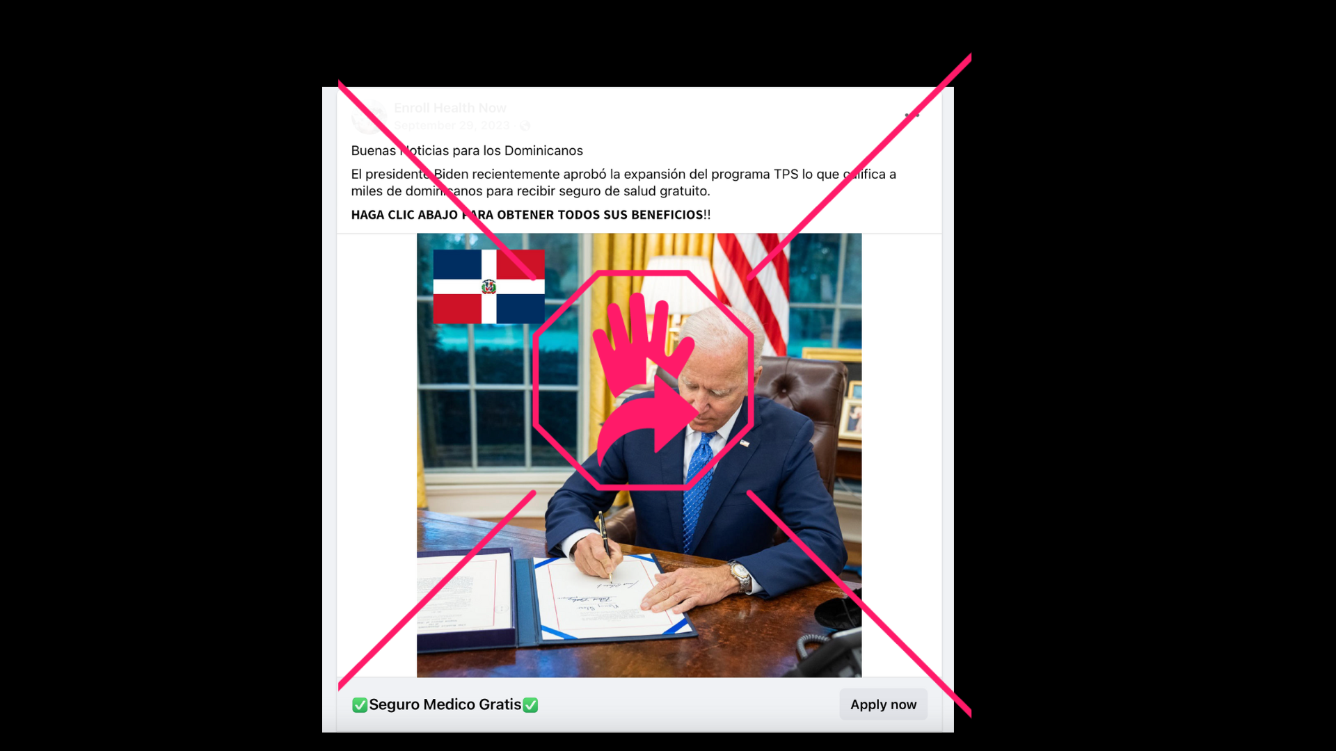 El texto del post, que incluye una foto de Biden sentado en un escritorio firmando un documento, asegura que hay "Buenas Noticias para los Dominicanos [sic]". Seguidamente, el texto indica que el mandatario "recientemente aprobó la expansión del programa TPS, lo que califica a miles de dominicanos para recibir seguro de salud gratuito”.