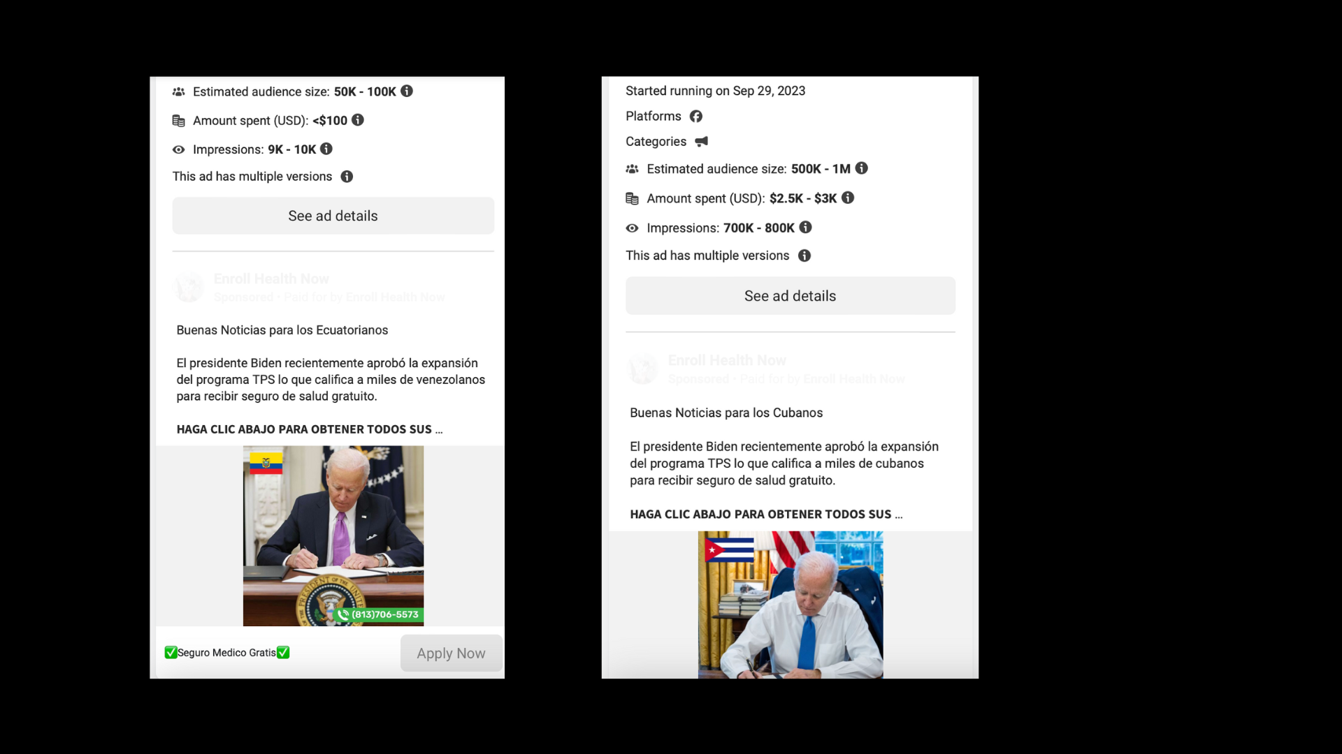 Al revisar el perfil del usuario que comparte la desinformación, notamos que el post es parte de una campaña publicitaria que ha invertido miles de dólares en anuncios similares. Estos avisos promueven seguros de salud gratuitos e incluyen textos parecidos sobre el TPS supuestamente ampliado a otros países, como Cuba y Ecuador, pero que tampoco se encuentran amparados por este beneficio, según pudimos corroborar el la página web del DHS.