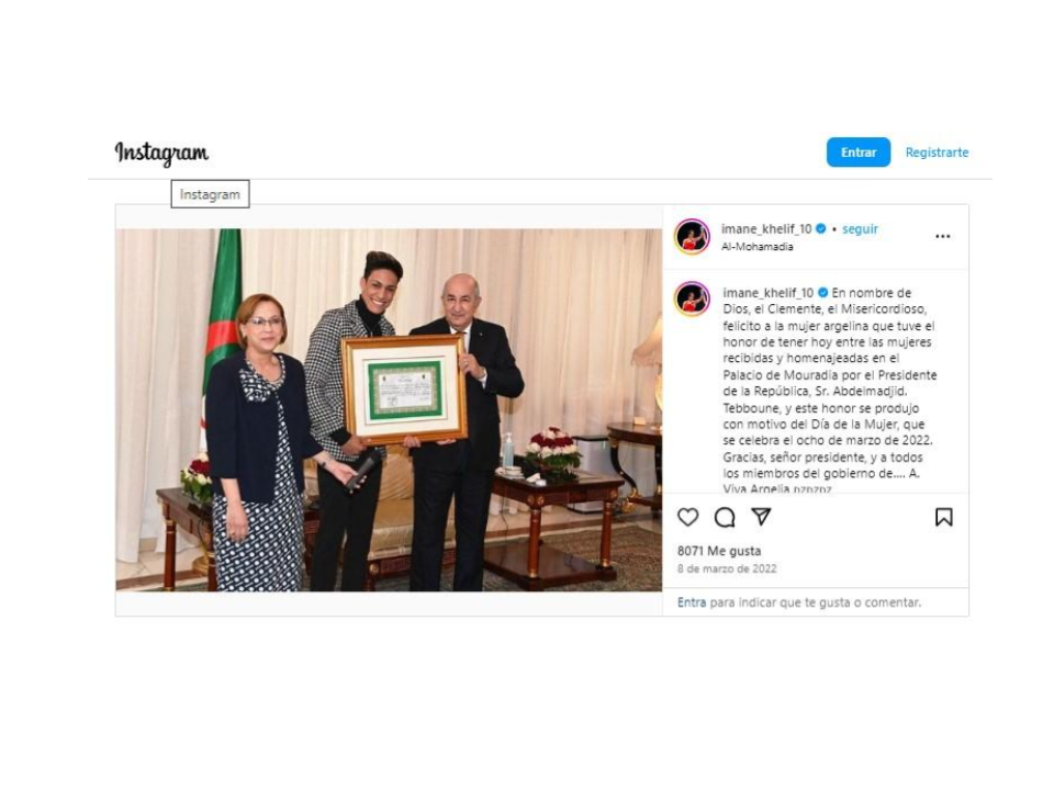 Asimismo, la boxeadora argelina es embajadora de buena voluntad de la Unicef, y en un artículo en su página web, también a propósito del día de la mujer este año, la organización destaca que Khelif es “ una de las mejores boxeadoras de Argelia”. Cuenta que practicar boxeo fue un reto para ella en un país donde no era bien visto que las niñas practicaran este deporte.
