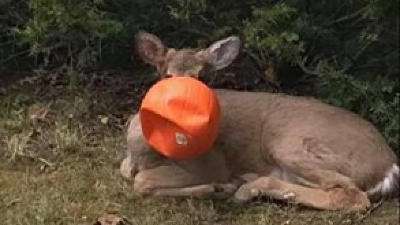 Rescatan a un ciervo con una calabaza de Halloween de plastico atascada en la cabeza