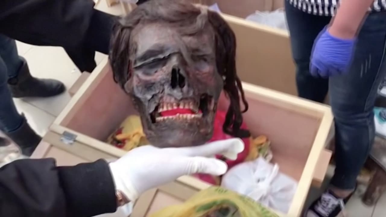 Agentes de la Policía Nacional de Perú y representantes del Ministerio Público y la Dirección de Cultura encontraron cerca de 5,000 piezas prehispánicas y coloniales, así como cabezas humanas momificadas, en el interior de una vivienda ubicada en la región de Cusco.