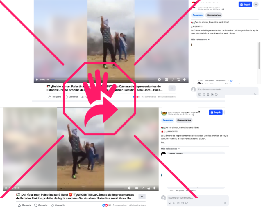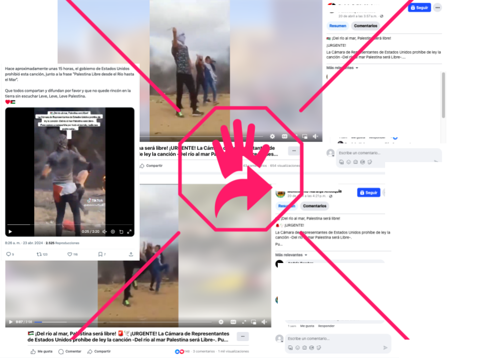 “¡Del río al mar, Palestina será libre! ¡Urgente! La Cámara de Representantes de Estados Unidos prohíbe de ley la canción ‘Del río al mar Palestina será Libre”, dicen publicaciones compartidas en Facebook en abril de 2024, que sumaban cientos de visualizaciones y comentarios.