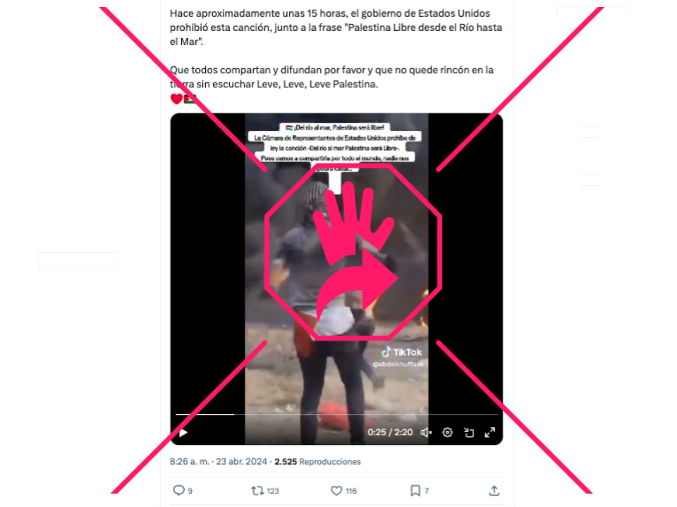 “Hace aproximadamente unas 15 horas, el gobierno de Estados Unidos prohibió esta canción, junto a la frase ‘Palestina Libre desde el Río hasta el Mar’. Que todos compartan y difundan por favor y que no quede rincón en la tierra sin escuchar Leve, Leve, Leve Palestina”, dice también un post compartido en X (antiguo Twitter) el 23 de abril de 2024 y que una semana después había sido reproducido más de 2,500 veces.