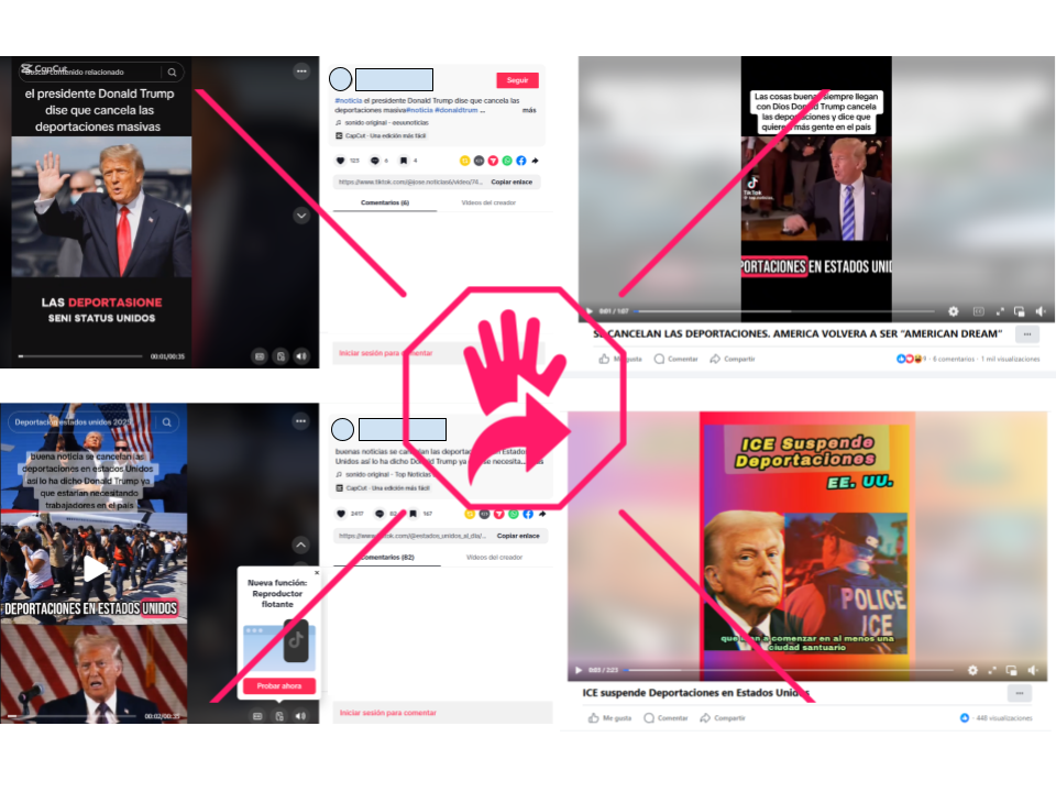 “Se cancelan las deportaciones. America [ sic] volverá a ser American Dream”, se lee en una de las publicaciones en Facebook, acompañada de un video en el que detallan falsamente que el presidente Trump supuestamente dijo “esta mañana” que quería mucha gente que trabajara, lo cual era una buena noticia para los inmigrantes en Estados Unidos “y los que están por venir”. En TikTok circulan también videos con la afirmación de la supuesta cancelación de las deportaciones.