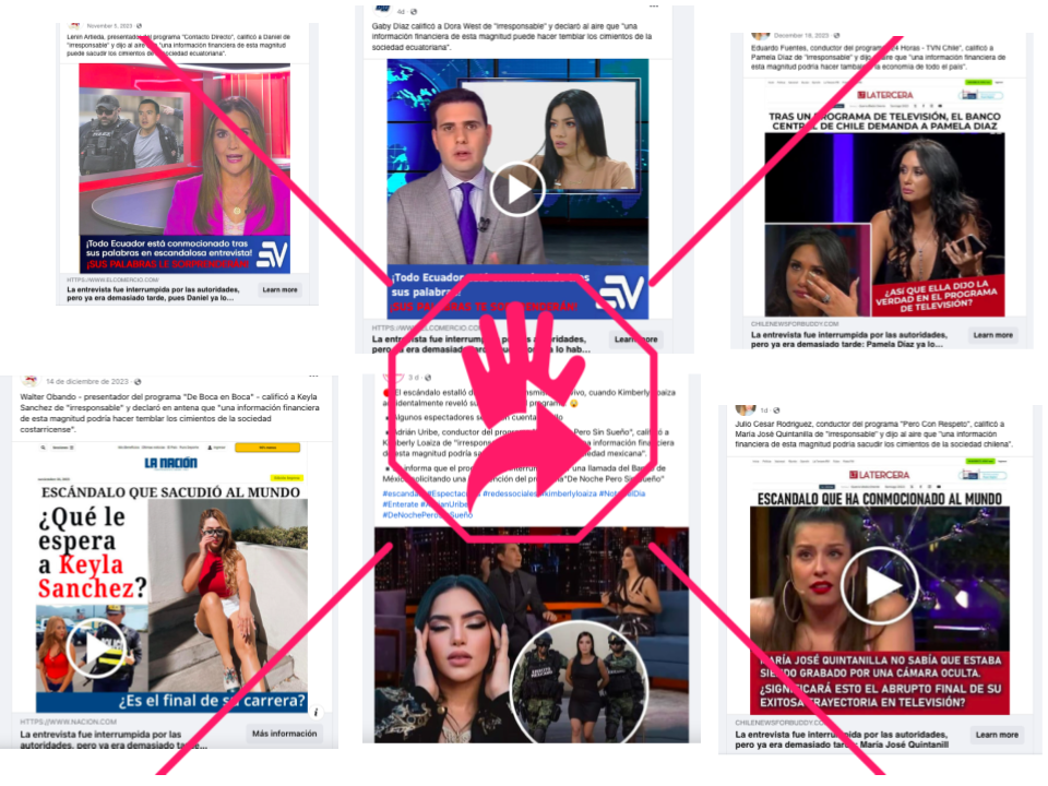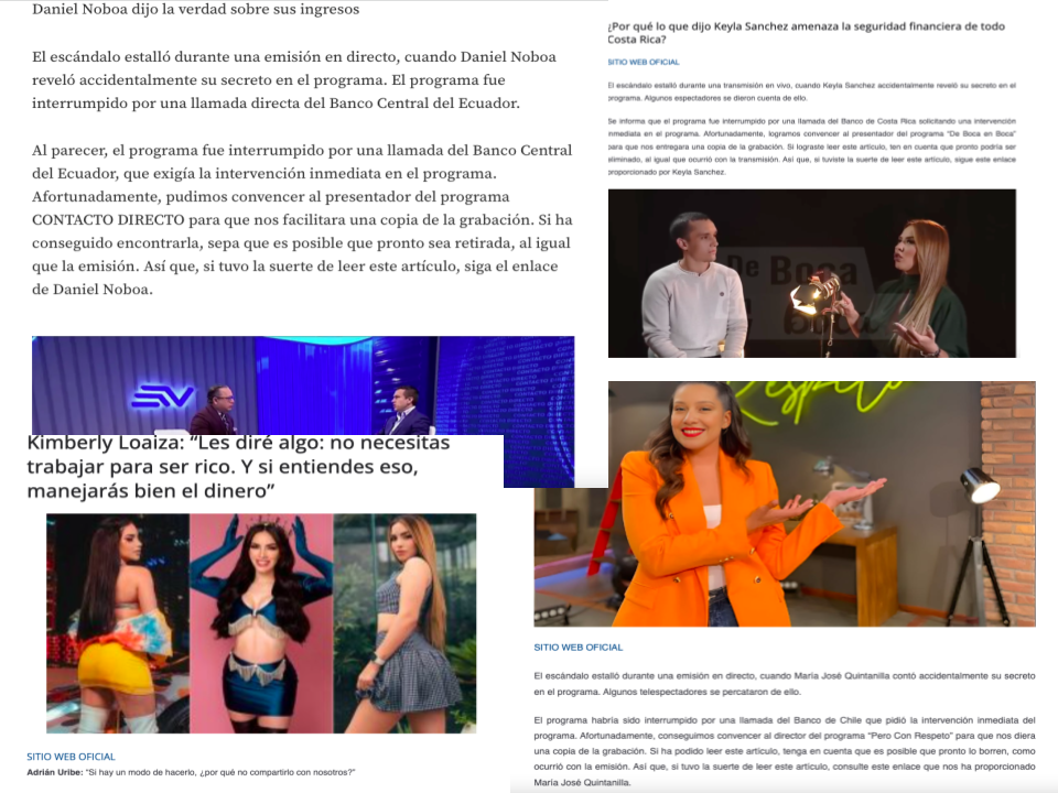 El esquema siempre es el mismo, los personajes varían según el país y van desde el presidente ecuatoriano, Daniel Noboa, a la cantante mexicana Kimberly Loaiza: fotos de su participación en algún reconocido programa de televisión —incluso a veces junto a montajes que hacen ver como si hubieran sido arrestados— son publicadas en Facebook con un texto que dice que el entrevistador tildó de “irresponsable” a ese famoso por revelar al aire una información financiera que podría “sacudir los cimientos de la sociedad”.