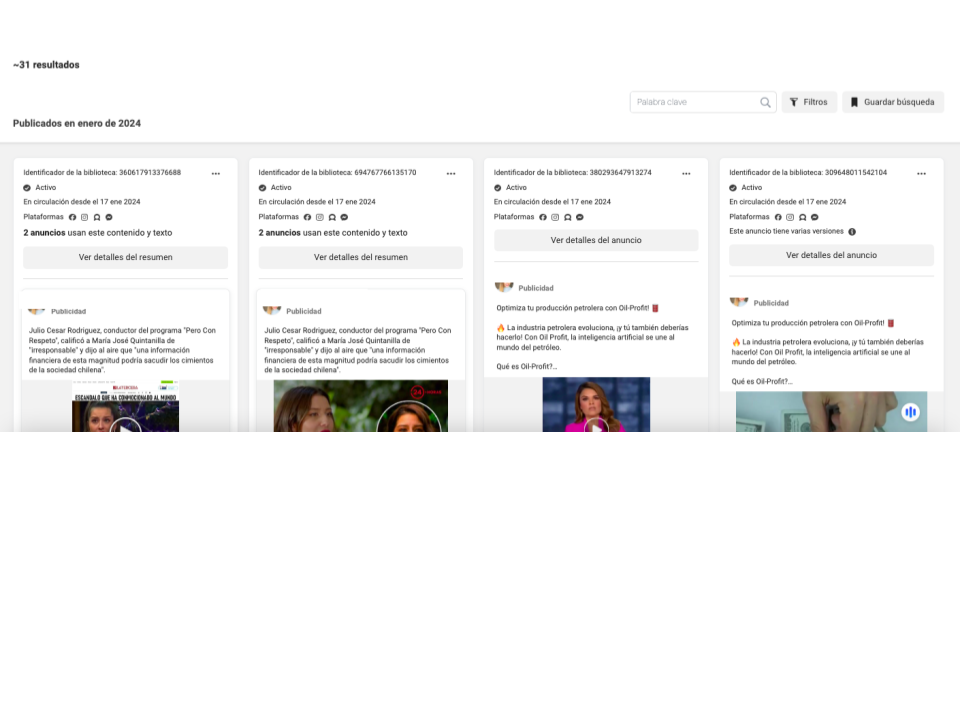 Las publicaciones con fotos de Lorena Castell, María José Quintanilla y Pamela Díaz también fueron difundidas como publicidad desde una misma cuenta, que a su vez ha publicado 31 anuncios en los últimos meses: algunos con este mismo esquema y otros sobre Oil Profit, una supuesta plataforma de inversión que también ha usado la imagen de figuras reconocidas –como el empresario Carlos Slim o el presidente de México, Andrés Manuel López Obrador– para atraer usuarios y que incluso fue denunciada públicamente por el gobierno mexicano.