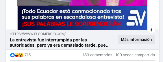 “Lenin Artieda, presentador del programa ‘Contacto Directo’, calificó a Daniel de ‘irresponsable’ y dijo al aire que ‘una información financiera de esta magnitud puede sacudir los cimientos de la sociedad ecuatoriana", dice una de las publicaciones en Facebook, en la que se ve una supuesta foto del presidente ecuatoriano, Daniel Noboa, siendo arrestado por la policía. El enlace, ubicado en la parte de abajo del post, pareciera además llevar al sitio del diario El Comercio.