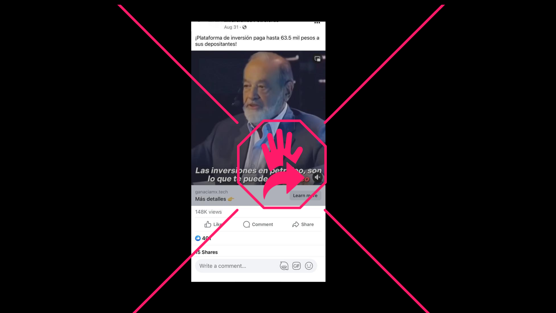 El multimillonario Carlos Slim aparece en un video difundido en Facebook que promete a los mexicanos obtener ganancias que “superan los 20,000 pesos por semana” al invertir en acciones de petróleo a través de una plataforma que opera de forma automática. Pero esto no es cierto. Si bien el que aparece en el video es Slim, el audio fue alterado, según confirmó su equipo, que además desmintió que el empresario promueva una plataforma de inversiones.