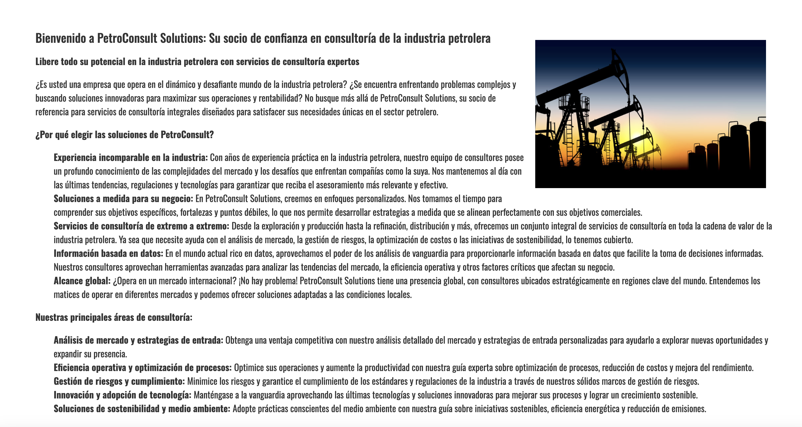 Al final del video, objeto de esta verificación, invitan a visitar un sitio web para obtener más información sobre la supuesta oportunidad. Al revisarlo, notamos que no mencionan nada sobre la supuesta plataforma de inversiones, sino que ofrece servicios de consultoría en la industria petrolera; además, piden datos personales como nombre y correo electrónico.