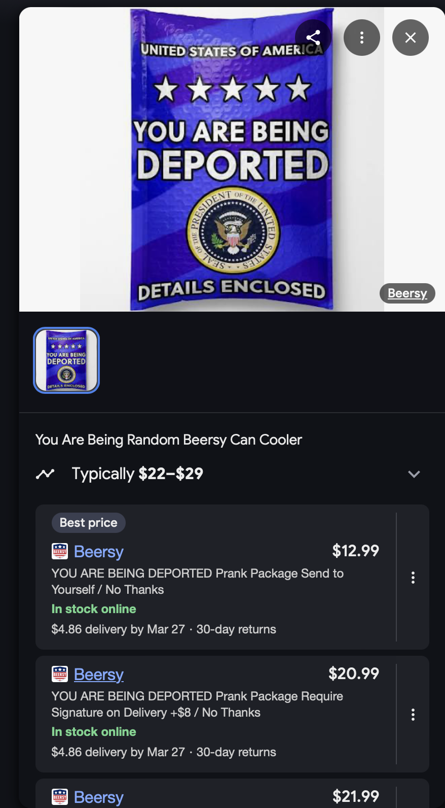 Usuarios en redes sociales señalan que los sobres azules con el mensaje en inglés "You are being deported" (estás siendo deportado) pueden adquirirse en línea y encontramos que estos sobres son descritos como una broma (prank) y se venden desde 12.99 dólares.