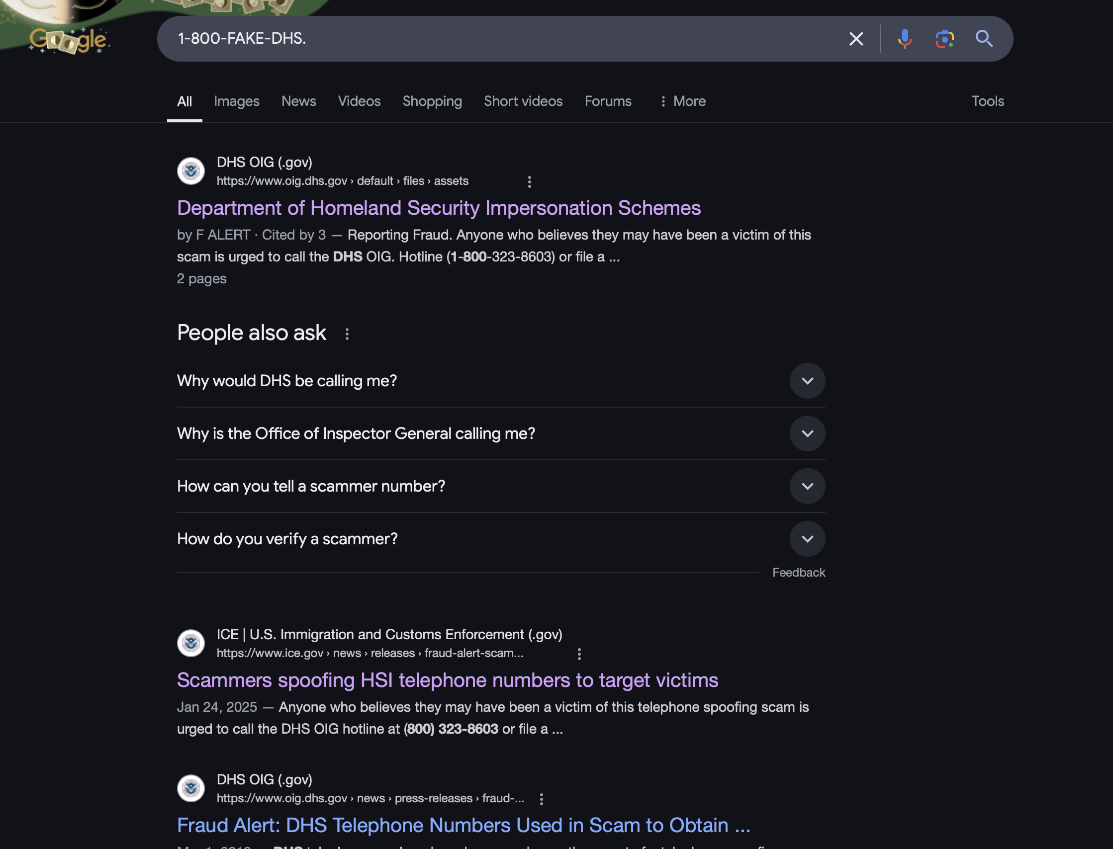 La carta, además, menciona un supuesto número telefónico "1-800-FAKE-DHS" (1-800-FALSO-DHS) al que pide que llames en caso de que consideres que esa notificación de deportación es un error. Al buscar ese número en el sitio web del DHS y en Google, no encontramos ningún registro oficial que lo vincule con la agencia federal que supuestamente firma la carta. La búsqueda, en cambio, arrojó una alerta de fraude, que advierte que "cada año, la Oficina del Inspector General del DHS (OIG) recibe cientos de informes de estafadores que se hacen pasar por empleados del DHS para defraudar al público".