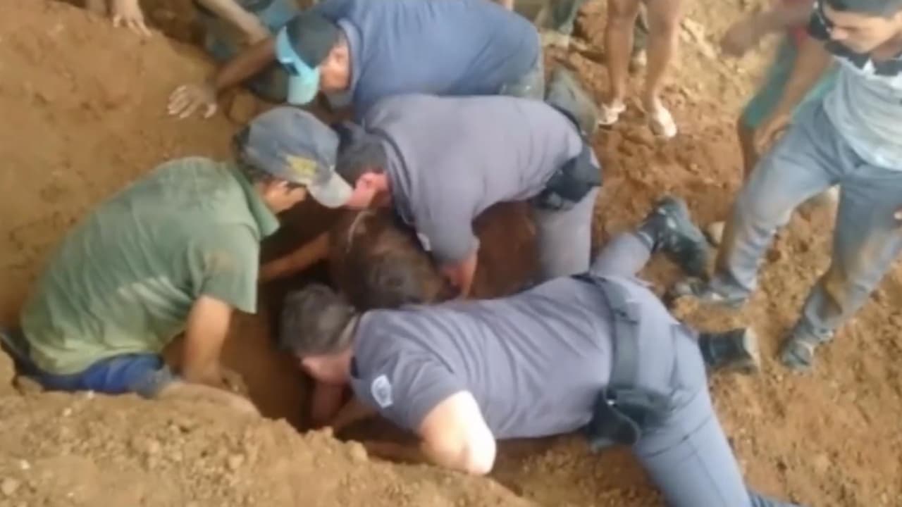 Miembros del 25º Batallón de Policía Militar del Interior en Brasil rescataron a una niña de 9 años en la ciudad de Pauliceia, tras quedarse sepultada en medio de la arcilla,
