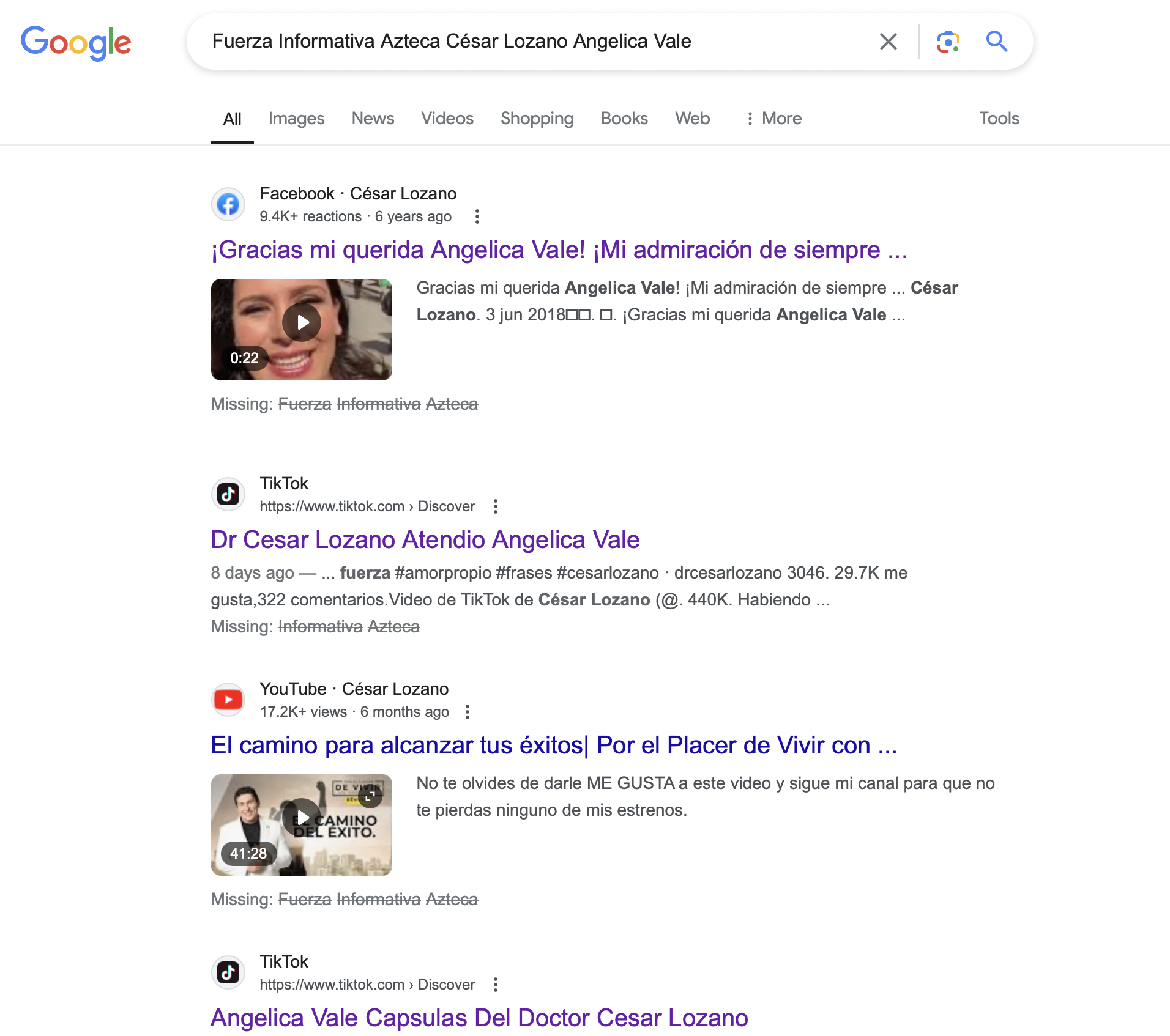 Desde elDetector lo primero que hicimos fue hacer una búsqueda en Google con las palabras clave Fuerza Informativa Azteca César Lozano Angelica Vale, pero, entre los resultados arrojados, no encontramos ningún artículo publicado por parte Fuerza Informativa Azteca ni por ningún otro medio que avale lo promovido en la publicación.