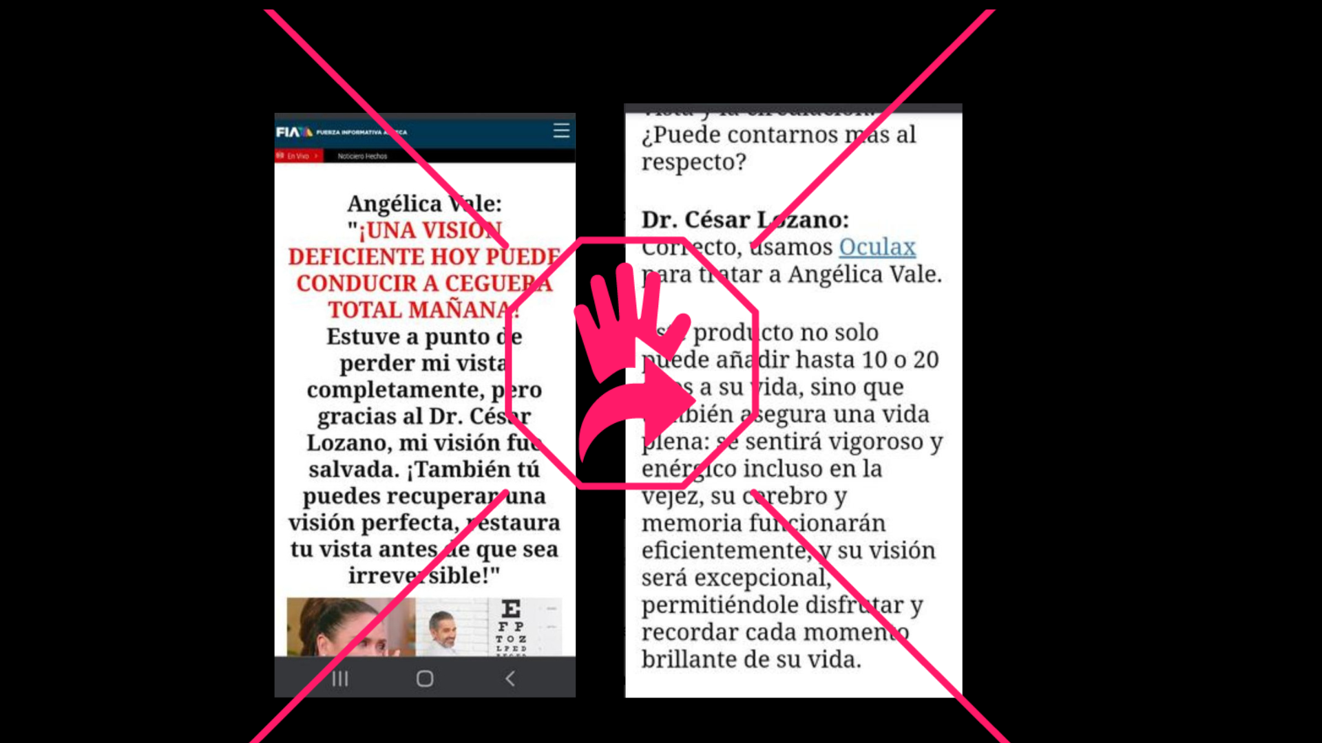 “Tú puedes recuperar una visión perfecta, restaura tu vista antes de que sea irreversible”, dice la publicación en la que supuestamente Vale agradece al “Dr. César Lozano” por salvarle la vista. En otra sección del mismo artículo, donde aparece el logo del medio mexicano Fuerza Informativa Azteca, se lee una aparente respuesta de Lozano diciendo: “Correcto, usamos Oculax para tratar a Angélica Vale”.
