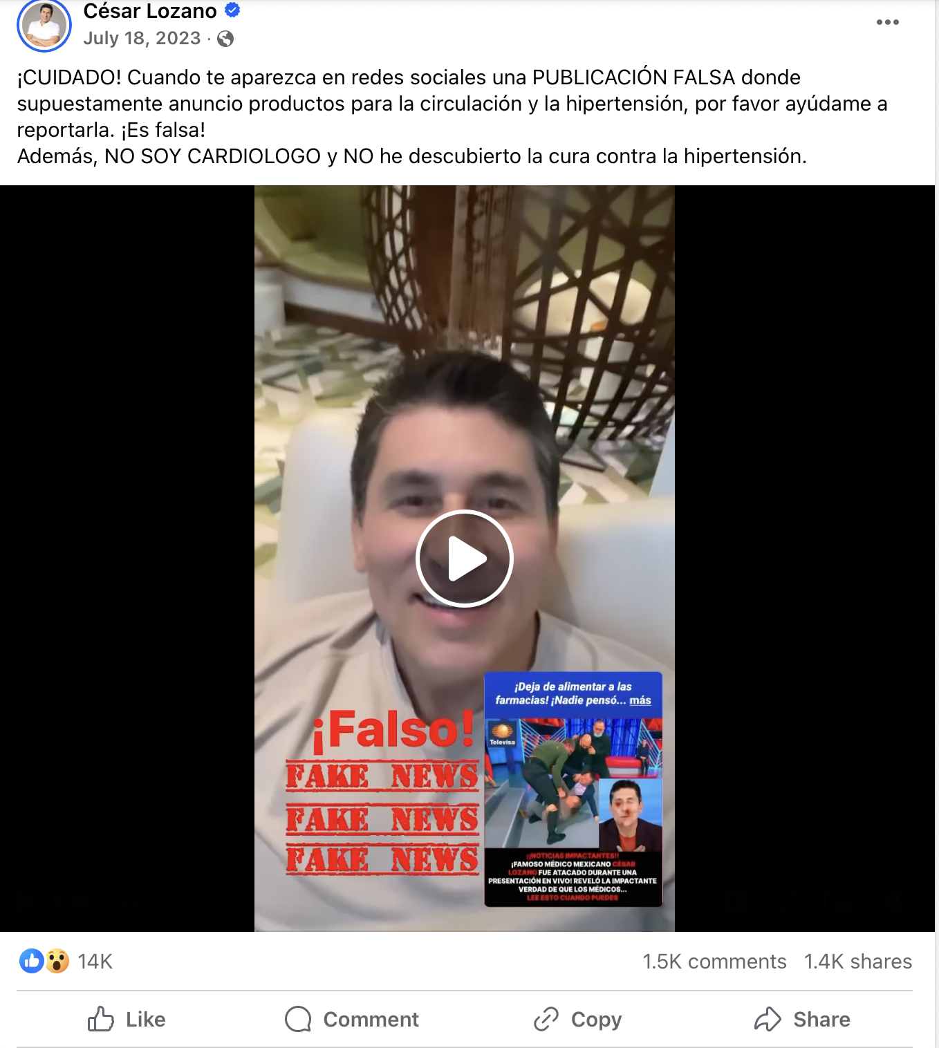 Más tarde, en diciembre de ese mismo año, el equipo de elDetector verificó una publicación en redes sociales que usaba la imagen de Lozano para hacer creer que él promocionaba un supuesto producto para aliviar las hemorroides con una sola aplicación. Esta afirmación resultó ser falsa. El equipo de Lozano desmintió que el conferencista lo respaldara.