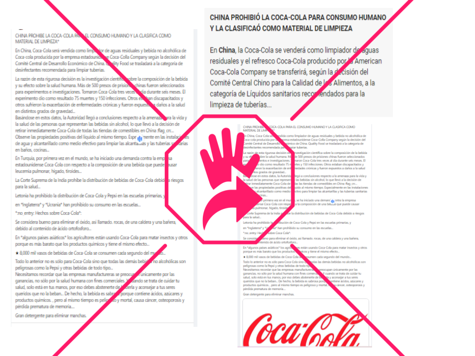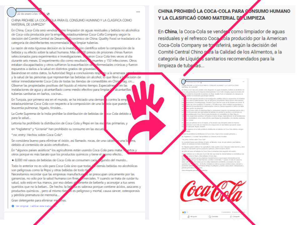 “China prohibió la Coca-Cola para consumo humano”, se lee en el mensaje que circula en WhatsApp y en Facebook. Añade que el refresco fue clasificado como “material de limpieza”: “En China, la Coca-Cola se venderá como limpiador de aguas residuales y el refresco Coca-Cola producido por la American Coca-Cola Company se transferirá, según la decisión del Comité Central Chino para la Calidad de los Alimentos, a la categoría de líquidos sanitarios recomendados para la limpieza de tuberías”.