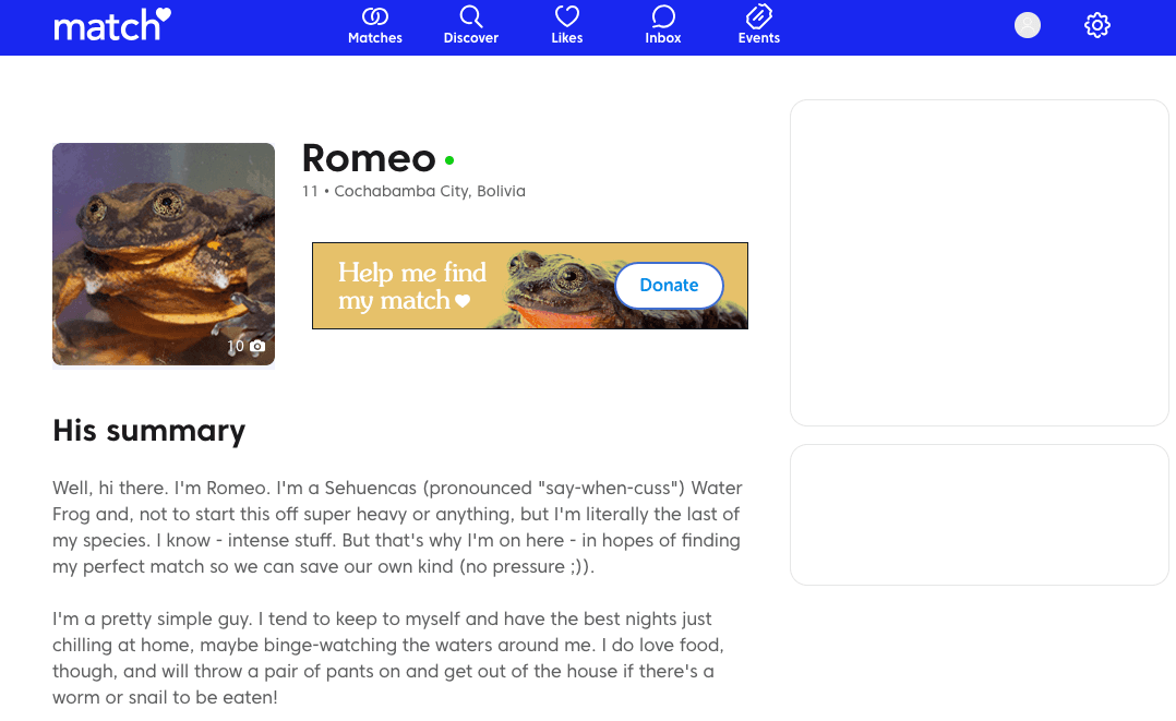 Romeo es una rana acuática boliviana en peligro de extinción que llevaba más de diez años en aislamiento. Ese es el tiempo que un grupo de científicos llevaba tratándole de encontrar una pareja para que, juntas, pudieran perpetuar la especie. La búsqueda ha tenido éxito con el hallazgo de cinco anfibios de su especie, entre ellos Julieta con la que prevén aparearla.