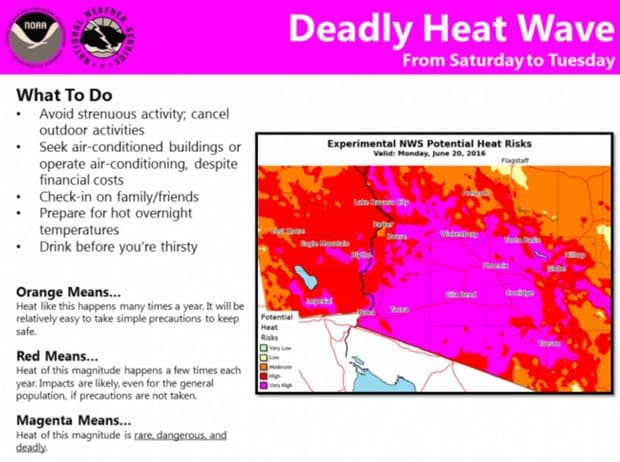 La razón de esta ola de calor es un frente de alta presión que se espera que llegue al suroeste a partir de este viernes. Los entre 115 y 120 grados que se esperan en su punto más alto generarán “nuevos récords el domingo y el lunes en muchos lugares”, de acuerdo al Servicio Nacional de Meteorología en Phoenix, quienes predicen un calor “raro, peligroso y mortal” en este aviso en inglés: