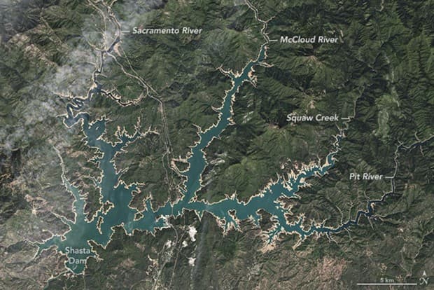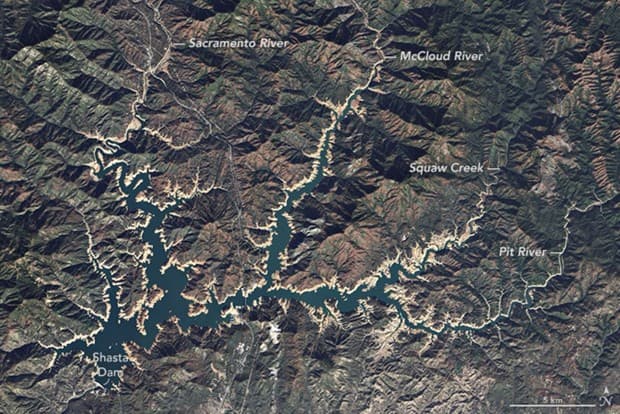 En diciembre pasado cualquier nadador que se hubiera zambullido a ciegas al lago Shasta —el embalse más grande de California— se hubiese revolcado cuesta abajo a lo Homero Simpson un buen trecho hasta dar con el agua. Los niveles del agua habían descendido en más de 100 pies (30 metros) comparado con sus niveles históricos. Hoy día, gracias a recientes lluvias, los niveles han mejorado notablemente.