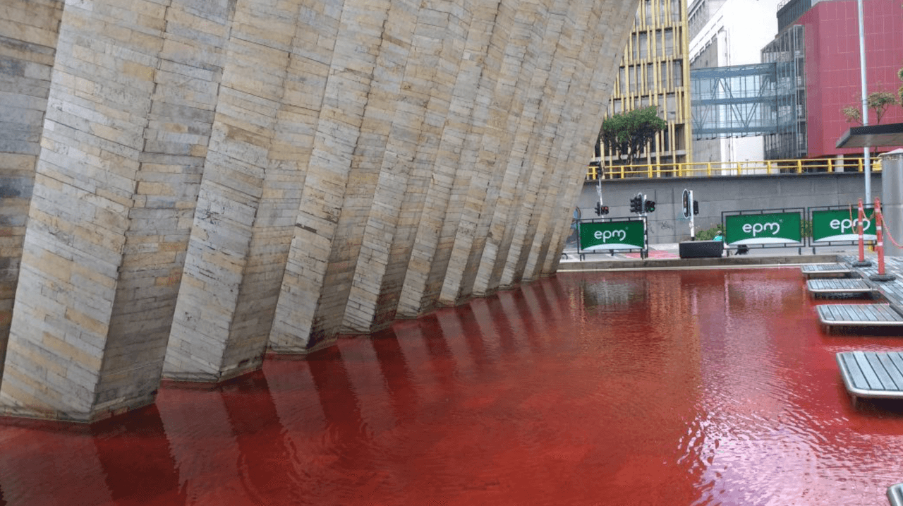 Cómo un grupo de artistas tiñó color sangre las fuentes de Medellín