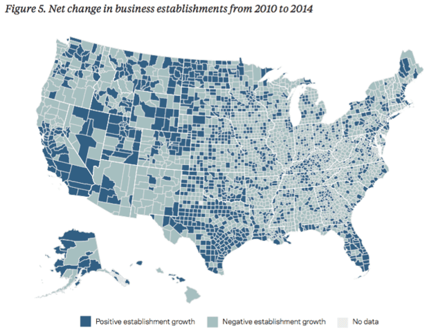 Por lo general, el reporte encuentra que cada vez más condados están viendo descensos en la inauguración de negocios durante los períodos de expansión nacional. Por ejemplo, durante los primeros cinco años de la recuperación económica de los años noventa, un 17% de los condados tuvieron descensos netos en sus inauguraciones de negocios. Ya para la recuperación en los años 2000, el porcentaje de condados con un descenso en la inauguración de empresas llegó a un 37%. Y para la década de 2010, dicho porcentaje casi se triplicó: aumentó en un 59%. De hecho, entre 2010 a 2014 aproximadamente 3 de 5 condados vieron más negocios cerrar que abrir y sólo un cuarto de todos los condados agregaron negocios a la misma tasa de la economía nacional.