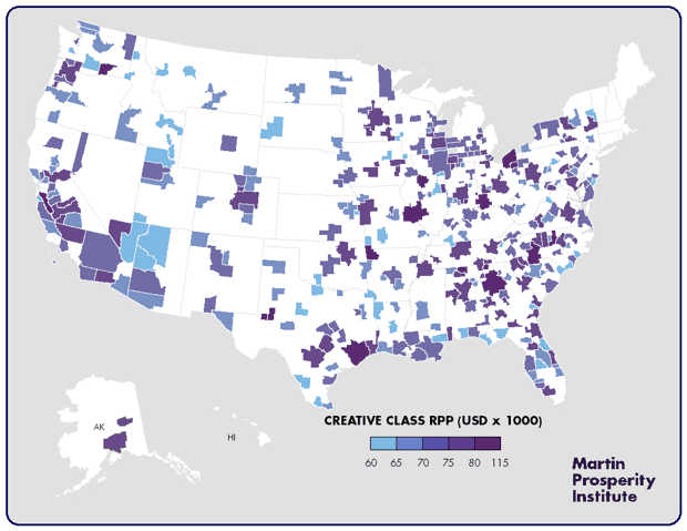 Estas cifras toman en cuenta tanto los trabajadores que ganan mucho y los que ganan poco. Sin embargo, la realidad es que la fuerza laboral estadounidense está dividida en tres grupos diferentes: las filas cada vez más reducidas de trabajos de clase obrera, los cuales constituyen aproximadamente un 20% de todos los empleos; los trabajadores bien remunerados del sector profesional, creativo y de conocimiento, el cual representa un tercio de todos los empleos en el país; y un grupo mucho más grande de trabajadores de servicios cuyos sueldos son más bajos. El último grupo consiste en trabajadores en servicios alimenticios y personales, así como en el comercio minorista, y constituye hasta un 45% de la fuerza laboral. Para entender mejor cómo son afectados los sueldos y sustentos, Charlotte Mellander -mi colega en el Martin Prosperity Institute o MPI- investigó los sueldos ajustados según el PRP de estos tres grupos de trabajadores en más de 350 áreas metropolitanas de EEUU. Taylor Blake (otro colega mío del MPI) creó un mapa de los resultados. En el mapa a continuación, las secciones de color morado oscuro representan las áreas metropolitanas con el mayor poder adquisitivo, mientras que las secciones de color azul claro representa las áreas con el menor poder adquisitivo.