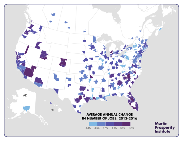 Mapa que representa la variación anual en el número de puestos de trabajo 2012-2016 (Martin Prosperity Institute).