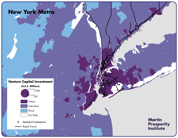 Área metropolitana de Nueva YorkEl mapa de abajo muestra el patrón que existe en el área metropolitana de Nueva York, la cual atrae 3,200 millones de dólares, o aproximadamente un 10% del total nacional. Un impresionante 75% de los primeros veinte vecindarios neoyorquinos que recibieron inversiones de capital de riesgo se clasifican como urbanos. Se trata de un porcentaje mucho más alto que en la región de la bahía de San Francisco o Boston-Cambridge. Como es de esperarse, hay una concentración fuerte de capital de riesgo en el Bajo Manhattan y más de un 80% de la inversión de capital de riesgo está ubicada en las áreas urbanas.
