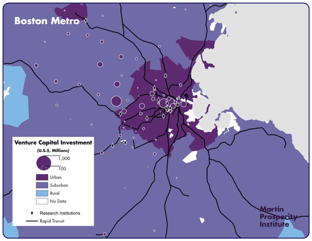 La inversión en capital de riesgo está sumamente concentrada a lo largo de las líneas de transporte público que prestan servicio tanto a Boston como a Cambridge. Dicha inversión también se extiende a los suburbios, especialmente en Lexington (149 millones de dólares), Bedford (125 millones de dólares) y Waltham en el oeste (484 millones de dólares), tal como indica la tabla abajo. En conjunto, en Boston y sus alrededores, un 23% de los trabajadores en barrios “de capital” llegan a sus empleos caminando, en bicicleta o mediante transporte público. En comparación, en toda el área metropolitana, sólo un 18% de los trabajadores optan por estos tres modos de transporte.