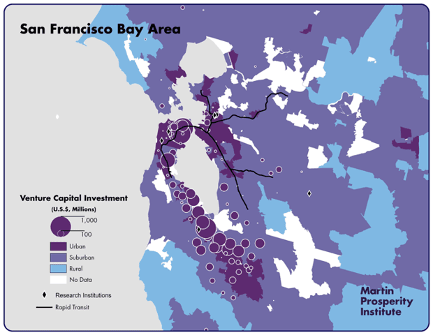 Esta región abarca San Francisco y sus alrededores junto con el Silicon Valley. Se trata del centro principal de la nación en cuanto a startups y la inversión en capital de riesgo: atrae más de un 40% del total nacional. En el mapa que aparece abajo, el color púrpura refleja los códigos postales urbanos, el azul más oscuro señala las áreas suburbanas y el azul más claro refleja áreas rurales. Ahí se ve la agrupación de círculos de color púrpura oscuro en San Francisco como tal, lo cual indica la enorme cantidad de capital de riesgo que fluye a vecindarios urbanos. Aproximadamente un 60% de toda la inversión en capital de riesgo en la región de la bahía está ubicada en códigos postales urbanos, mientras que un 40% se encuentra en los suburbios.