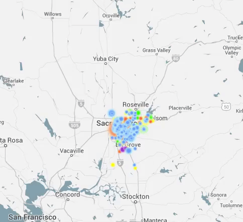A modo de comparación, aquí está el condado de Sacramento en California. Quizás no sea un centro tan grande para trabajadores, como los otros condados que señalamos, pero aún atrae trabajadores de distancias bastante grandes.