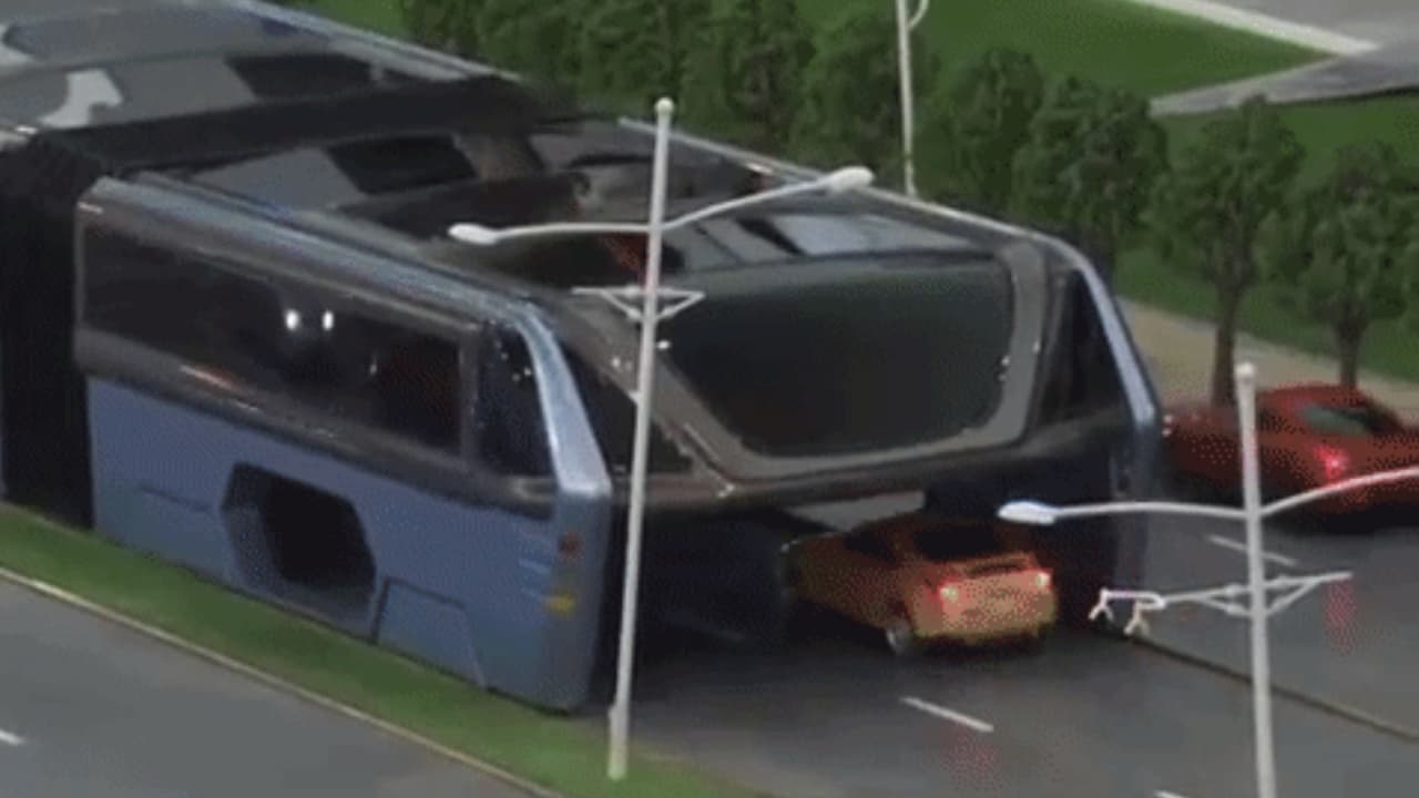 El autobús se extendería por dos pistas y podría llevar a hasta 1,400 pasajeros. Viajaría a hasta 40 millas por hora sobre la calle en una vía especial, permitiendo que los vehículos de menos de siete pies de altura pasen libremente por debajo de éste (como un toque extra, su parte inferior incluso simula el cielo).
