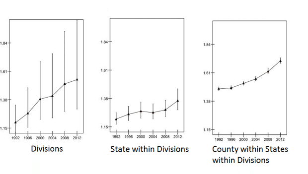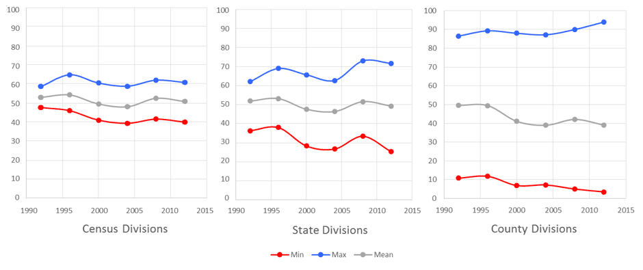 El gráfico arriba muestra la distribución de votos para estas divisiones, estados y condados usando el porcentaje mínimo, máximo y promedio de votos demócratas que obtuvo cada nivel geográfico. La conclusión es que hay pruebas considerables de una polarización espacial creciente a lo largo de los tres. Aparte de un pequeño aumento en 1996, ha habido un descenso general en la cantidad mínima de votantes demócratas y un incremento en la cantidad máxima de votantes demócratas en casa escala.