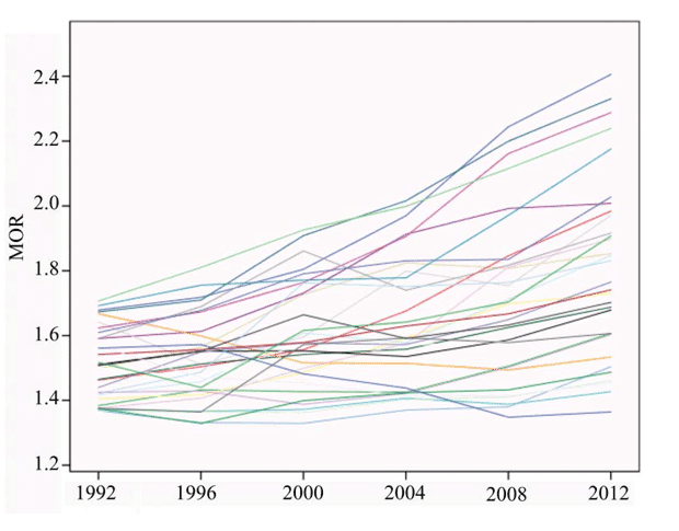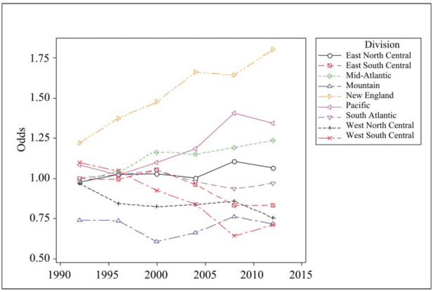 El estudio entonces toma prestado tácticas de investigaciones sobre la segregación geográfica para crear una medida más amplia que designa la “proporción media de probabilidades” de polarización política para cada uno de estos tres niveles. Tal como muestran los gráficos de arriba, estas proporciones de probabilidades también aumentan de manera consistente durante las dos décadas entre 1992 y 2012. De hecho, el estudio encuentra que la polarización incrementó en un 29% a lo largo de regiones censales, en un 12% a lo largo de estados y en un 14% a lo largo de condados durante este período.