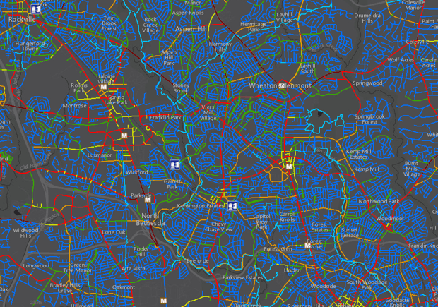 Justo al norte de Washington DC, los planificadores del transporte en el condado Montgomery, en Maryland, están empleando un enfoque sistemático para acabar con este ciclo vicioso. Con su nuevo Bicycle Stress Map (Mapa del Estrés en Bicicleta) los planificadores del condado han cuantificado y trazado en mapas el “nivel de estrés causado por el tráfico” de la red de vías dedicadas a ciclistas en el condado. Asignaron un valor numérico y un color correspondiente a cada calle y pista para ciclistas.