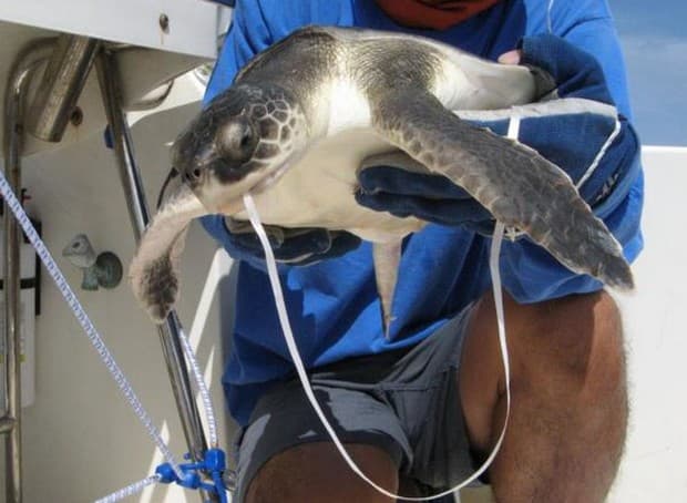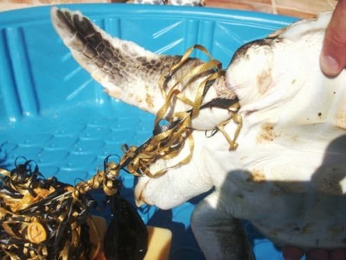 ¿No lo cree? Pues eche un vistazo a esta tortuga con una cuerda de globo saliéndole de la boca: