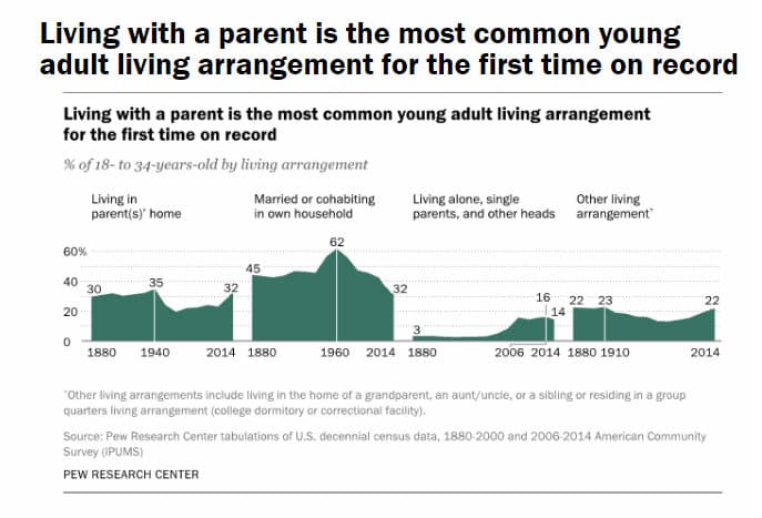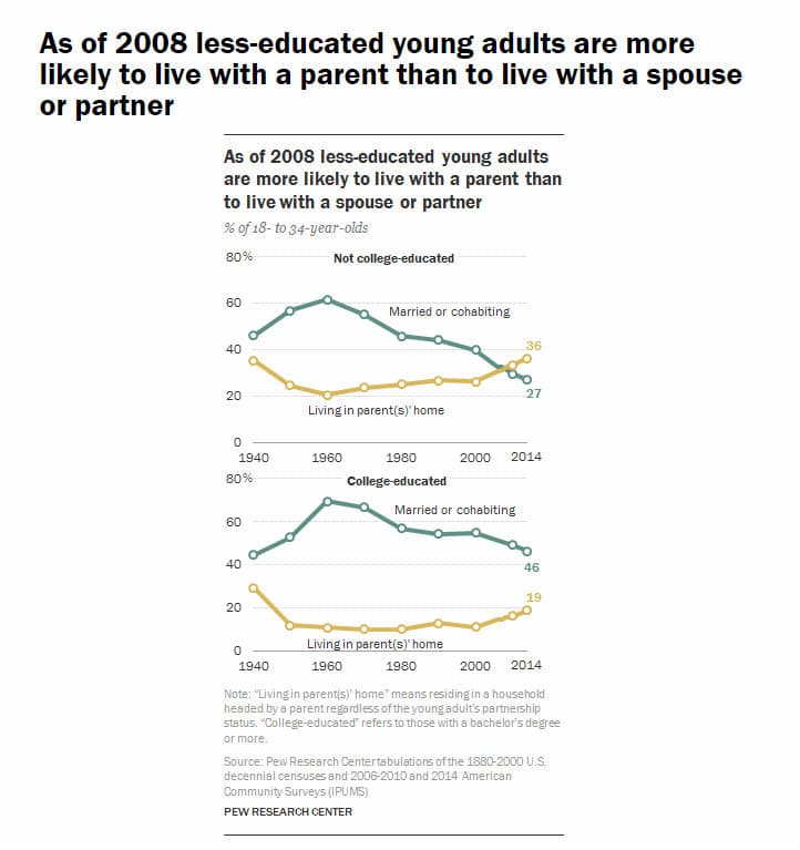 Durante más de 130 años, la situación domestica más común para los adultos jóvenes era vivir con un cónyuge o pareja. Vivir con la pareja llegó a su nivel máximo en los años sesenta del siglo XX, cuando un 62% de adultos entre 18 y 34 años vivían con sus parejas en sus propias casas y sólo un 20% de ellos vivían con sus padres. Para 2014 un 31.6% de adultos de estas edades vivían con sus parejas frente a un 32.1% que vivían con sus padres. Este es un punto de inflexión en la era moderna (el resto de los jóvenes de este grupo etario estaban solos en sus propias casas o viviendo en las casas de otro familiar, de otro amigo o bien en dormitorios universitarios).