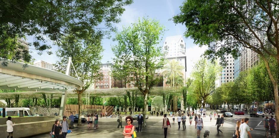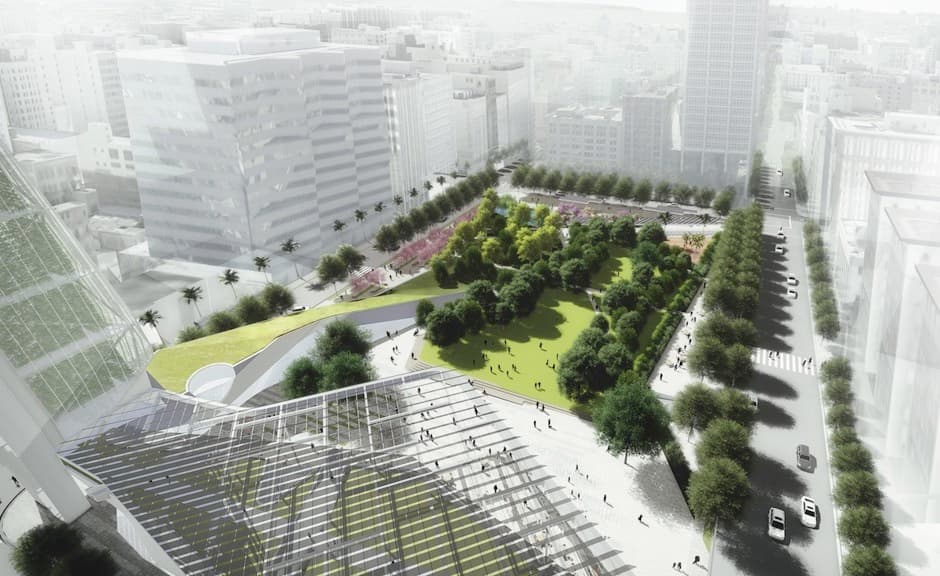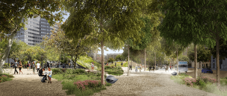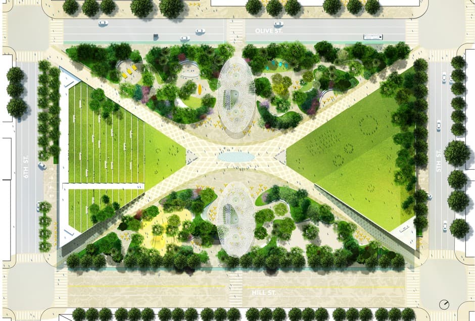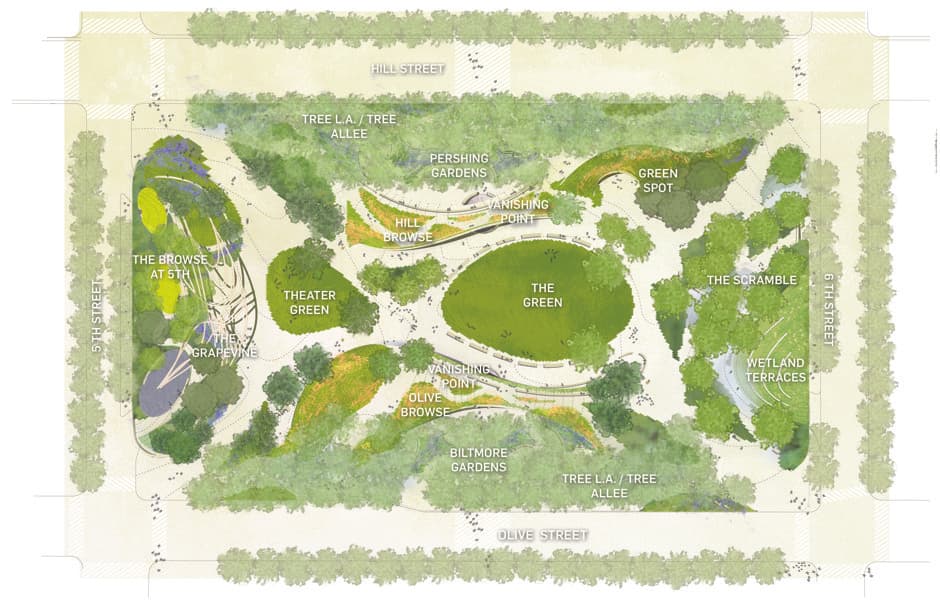 Los cuatro equipos quieren derrumbar aquellos muros y reintegrar a Pershing Square al nivel de la ciudad. Y cada plan transforma a la plaza en un parque. A continuación están imágenes de cada uno de los diseños finalistas propuestas que demuestran cómo difieren los planes.
